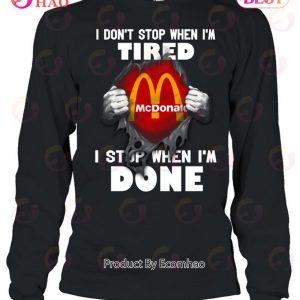 .This Mc Donald I Don’t Stop When I’m Tired I Stop When I’m Done T-Shirt is perfect for the motivated, driven individual looking to make a statement. This cotton and polyester blend t-shirt provides a comfortable fit that is breathable and easy to wear all day. Its powerful statement “I don’t stop when I’m tired. I stop when I’m done” will light a fire in anyone who wears it and will allow them to get through any situation. The shirt comes in a variety of colors and sizes so you can find the perfect one for you. With this shirt you’ll be stylish, comfortable, and motivated to rise up and take on whatever may come your way.